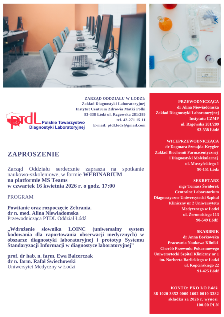 zapraszamy na zebranie naukowo-szkoleniowe Łódzkiego Oddziału PTDL, które odbędzie się w formie webinaru online (MS Teams) w dniu 16.04.2026r o godz. 17:00.